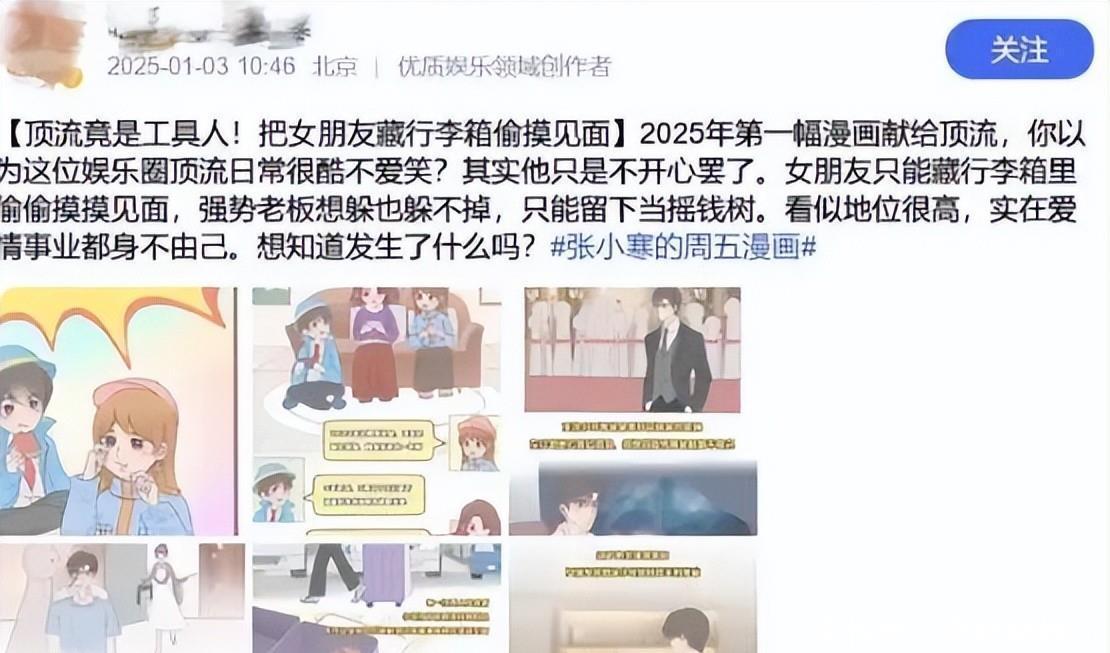今天刷到王一博上节目说没考虑结婚,我就在想,这人真挺实诚的。一年前那个行李箱藏女友的事闹得沸沸扬扬,现在他自己出来说话了,反而让人觉得踏实。原来他根本没在谈恋爱,也没打算成家,就一心扑在拍纪录片和攀岩上。这事还得从2025年1月说起。有个叫张小寒的狗仔发了几张漫画,说某顶流把女友藏行李箱里偷摸见面。画里男生酷酷的不爱笑,公司地位高但身不由己。网上立马炸锅,大家直接对号入座,觉得说的就是王一博。