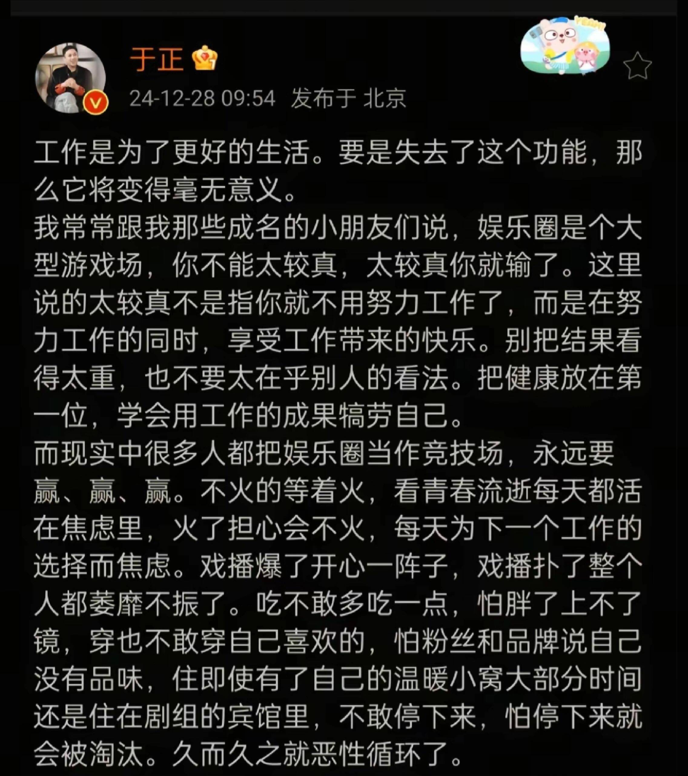 这场闹剧里最无辜的当属于正。有网友翻出他三年前直播时吐槽“梦女”许荔莎的言论,将两件事强行关联。面对突如其来的“背锅”,于正没有动怒,反而在朋友圈发文:“某些人想红想疯了,拉着不相干的人炒作,建议直接报警。”简短一句话既撇清关系,又暗指爆料可信度存疑,连路人都忍不住点赞:“于妈这波回应太绝了!”事件发酵两天后,司晓迪的社交账号突然清空所有内容,有消息称其老板已报警并索赔200万。这场“抑郁症控诉”最终沦为娱乐圈又一场闹剧,留给公众的思考却挥之不去:当抑郁症成为博眼球的工具,真正需要帮助的患者该何处发声?而那些被卷入舆论漩涡的艺人,又该如何应对这种无差别攻击?或许正如网友所说:“内娱的瓜可以乱吃,抑郁症三个字,真的别拿来消费。”